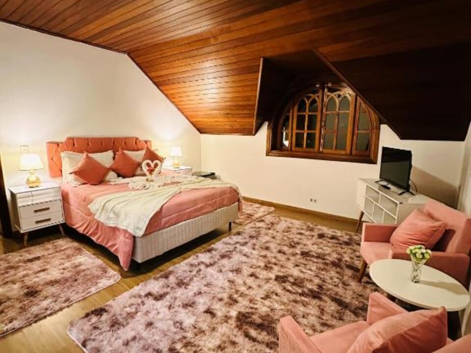 A Suíte Rosé é o cenário ideal para casais que desejam viver momentos especiais em Campos do Jordão. Com um estilo romântico e elegante, a decoração em tons de rosa cria uma atmosfera acolhedora, delicada e cheia de charme, perfeita para celebrar o amor e
