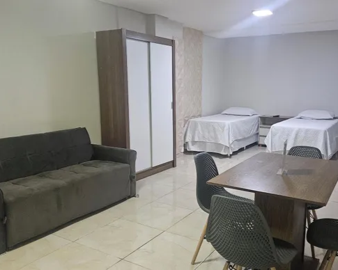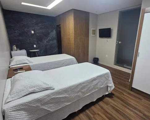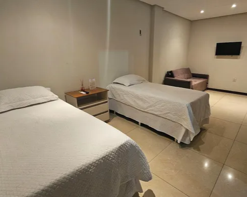 2 camas de solteiro Configuração : sala de jantar e área de estar. Internet : Wi-Fi de cortesia 100 Mbps ou mais.