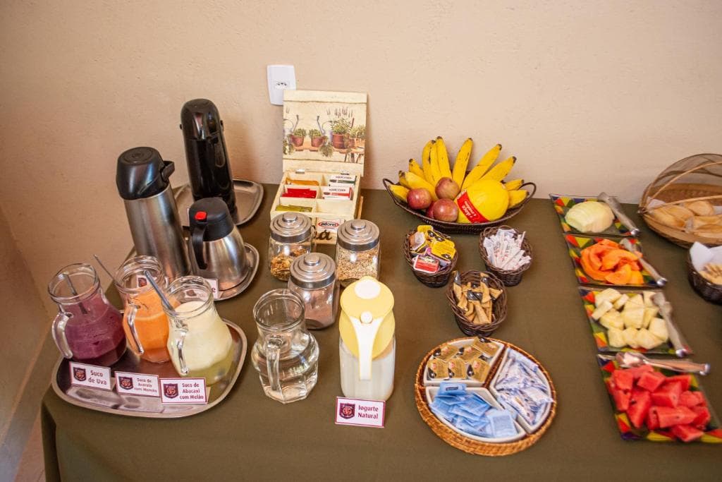 NÓS ( 13. 14 E 15) , SAÍMOS PARA TOMAR CAFÉ FORA. A POUSADA NÃO TEM UM SUCO VERDE, AS FRUTAS MUITO MAL COLOCADAS E EM POUQUISSIMAS QUANTIDADE, A GRANOLA NÃO É BOA, TUDO MUITO ARTIFICIAL! FALTA BONS BOLOS, NÃO VI CANELA PARA COLOCAR NAS FRUTAS ( AS QUAIS PRECISA MELHORAR O CORTE E A APARÊNCIA), FALTA BONS IOGURTES, QUITUTES DE QUALIDADE, ENFIM FALTA VIDA, FALTA AMOR, CARINHO NESTE CAFÉ DA MANHÃ!