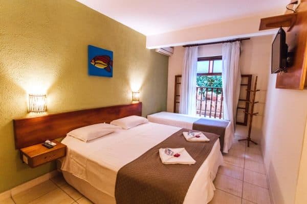 Equipado com uma cama Queen Size ou duas camas de solteiro, mais uma cama de solteiro, Ar-Condicionado Split, Smart TV, Wi-Fi, frigobar, mesa de trabalho, guarda rou